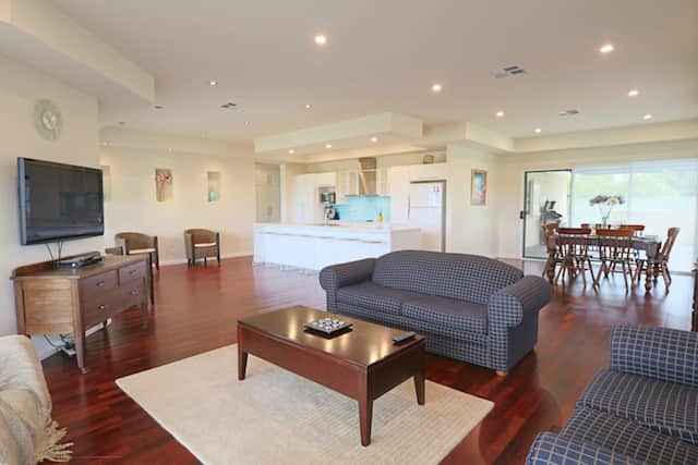 If you can't look out at the ocean while in Robe this must be the next best thing. Located in the centre of Robe and within easy walk to restaurants, cafes and shopping this four bedroom, three bathroom holiday home is the perfect destination to get away from it all. Directly opposite the beautiful Robe Golf Course and just down from the Robe Sports Ground the views from inside this Robe property are stunning and will suit golfing enthusiasts or those who like to stay right in the thick of it equally. Configured to comfortably sleep four couples plus extras in four bedrooms with a master bathroom and two ensuites the sleeping is taken care off plus a second living area allows everyone to have their own space. Outside there is a very large entertaining area under the main roof with a hooded BBQ and outdoor setting as well as a large lawned area and ample parking room allowing for everyone to bring their own vehicle plus toys. Starfish Blue is a modern, light filled holiday home located in a sort after area of Robe. Access to the village is simple and yet the views suggest resort style relaxation and fun with friends and family.
