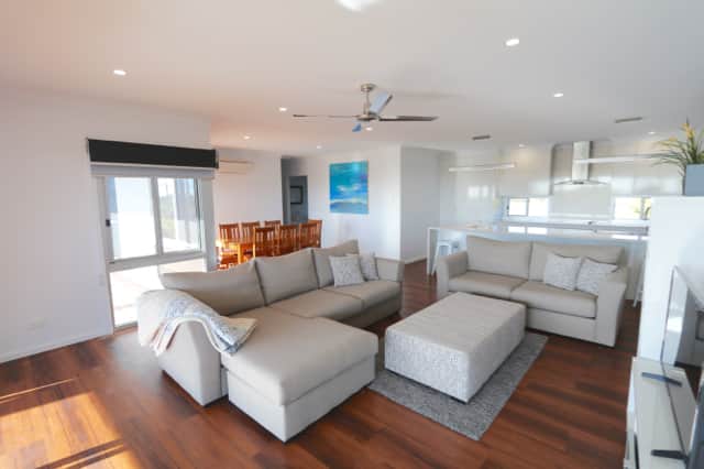 This two storey property is located on The Esplanade overlooking Robe’s famous Long Beach. Formally a small beach shack this property has undergone a major face lift at the end of 2017 and is now a holiday makers dream. Featuring a large main living area upstairs which opens up, through glass sliding doors, onto a magnificent deck this property enables guests to soak in Robes scenic Guichen Bay from both the main living and master bedroom. This magnificent holiday house now comfortably sleeps ten guests in four bedrooms with two living areas and two bathrooms. Enjoy short walks across the road to Long Beach or walk the entire coastal trail and meander into the heart of Robe in approximately thirty minutes (or a short 3km drive). This property has plenty of space for everyone to relax, a second living area downstairs with flat screen TV, modular lounge and fusball table is sure to keep the young at heart entertained during poorer weather or in the evenings. Enjoy entertaining in the expansive and fully equipped kitchen and living area upstairs or move out onto the large undercover deck and BBQ area. Surf and Sand provides the perfect spot to while away the days and evenings whilst listening to the sounds of the ocean, relax and explore the wonders of Robe and the Limestone Coast.